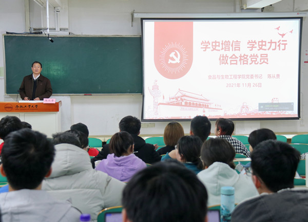 11月26日晚,为进一步提高入党积极分子班学员的政治理论水平和思想觉悟,食品与生物工程学院在翠五教108开展以《学史增信、学史力行,做合格党员》为主题的党课,第66期入党积极分子班全体学员参加。