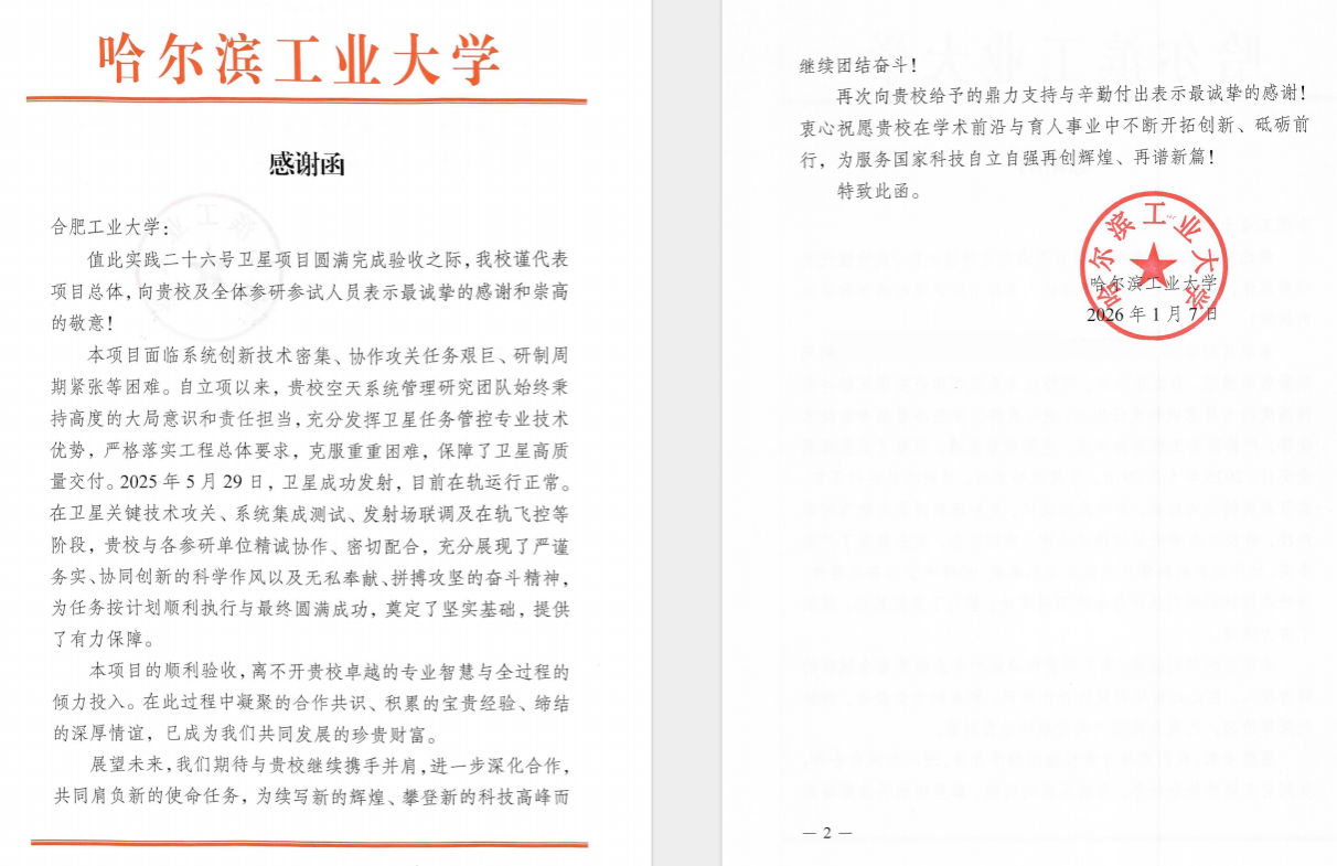 哈尔滨工业大学在感谢函中表示,项目的顺利验收离不开合工大的鼎力支持,期待继续深化合作,共同肩负新的使命任务,为续写新的辉煌、攀登新的科技高峰继续团结奋斗,并祝愿学校在学术前沿与育人事业中不断开拓创新,为服务国家科技自立自强再谱新篇。