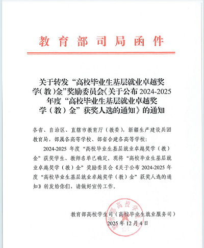 为加强高校毕业生择业就业观引导,发挥基层就业典型引领示范作用,从2022年起,由教育部高校学生司(高校毕业生就业服务司)、教育部学生服务与素质发展中心共同指导,中国长江三峡集团出资,中国教育发展基金会设立“高校毕业生基层就业卓越奖学(教)金”项目,奖励在基层就业有突出业绩和显著成效的高校毕业生、服务毕业生赴基层就业有突出贡献的教师,选树优秀典型。2024-2025年度,全国418名高校毕业生获此殊荣,熊朝敏的入选充分彰显了我校毕业生的过硬素质与责任担当。