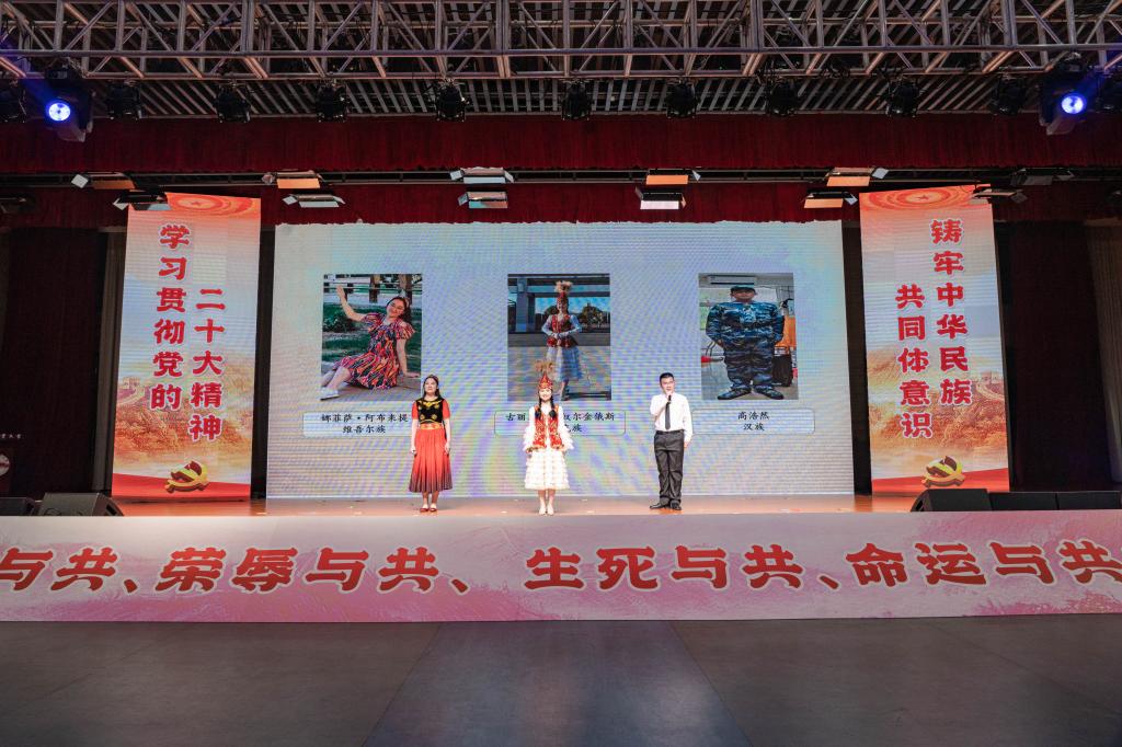 第三篇章以“爱国爱党,践行伟大复兴青春使命”为主题。在该篇章中,维吾尔族学生克迪尔亚·吾拉木以《行走的“界碑”》为题,讲述了在喀喇昆仑山卫国戍边行动中英勇牺牲的陈祥榕等英雄的故事;维吾尔族学生艾力卡尔·艾司卡尔江以《雄鹰之魂映党心》为题,讲述塔吉克族党员拉齐尼英勇救人的故事;柯尔克孜族学生阿依扎达・买买提玉米尔以《守我山河志不移》为题,深情讲述了家乡“人民楷模”荣誉获得者布茹玛汗·毛勒朵60年如一日,忠诚守卫着祖国边境线的感人故事。展演节目还包括民族歌舞串烧《吉祥如意》、民族乐器合奏《美丽的神话》和歌舞情景剧《青春界碑》。整个展演充分体现了新时代工大各民族学子朝气蓬勃,奋发有为的精神面貌。