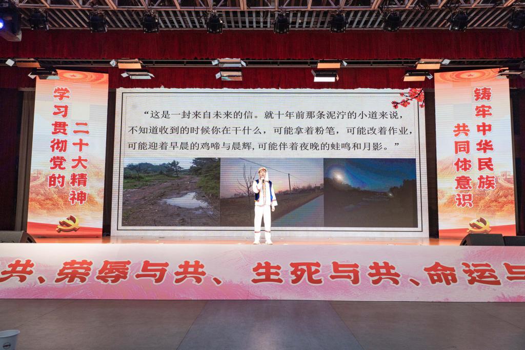 展演在欢快的歌舞《父亲的草原母亲的河》中拉开序幕。活动共三个篇章。第一篇章以“踔厉奋发,奏响百年伟业最美旋律”为主题,在该篇章中,回族学生马荣伯和海文香以《那片沙海是咱的家》为题,深情讲述了家乡各族人民在中国共产党的带领下从实现脱贫攻坚到乡村振兴的沧桑巨变;朝鲜族学生方心以《脱贫路上绽放民族之花》为题,讲述了以黄文秀为代表的各民族人民奋发向上,奋勇向前的脱贫故事;哈萨克族学生木力德尔·哈能以《红星》为题,讲述了已故帮扶干部王红星同志带领新疆青河县人民赢得脱贫攻坚战的故事。