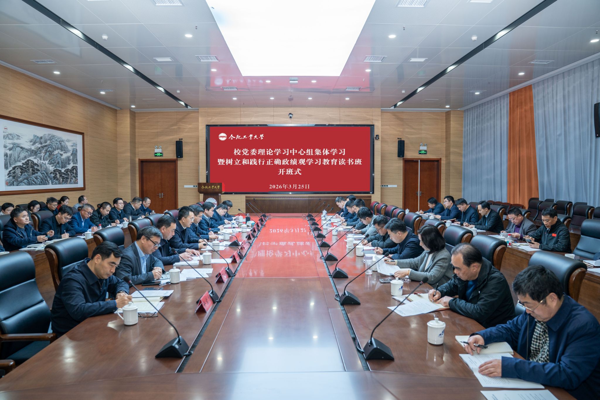 3月25日下午,学校举行树立和践行正确政绩观学习教育读书班开班式暨校党委理论学习中心组集体学习。校党委书记于祥成主持会议并讲话,校党委理论学习中心组固定成员、学习教育工作专班成员、各二级党组织负责人参加学习。