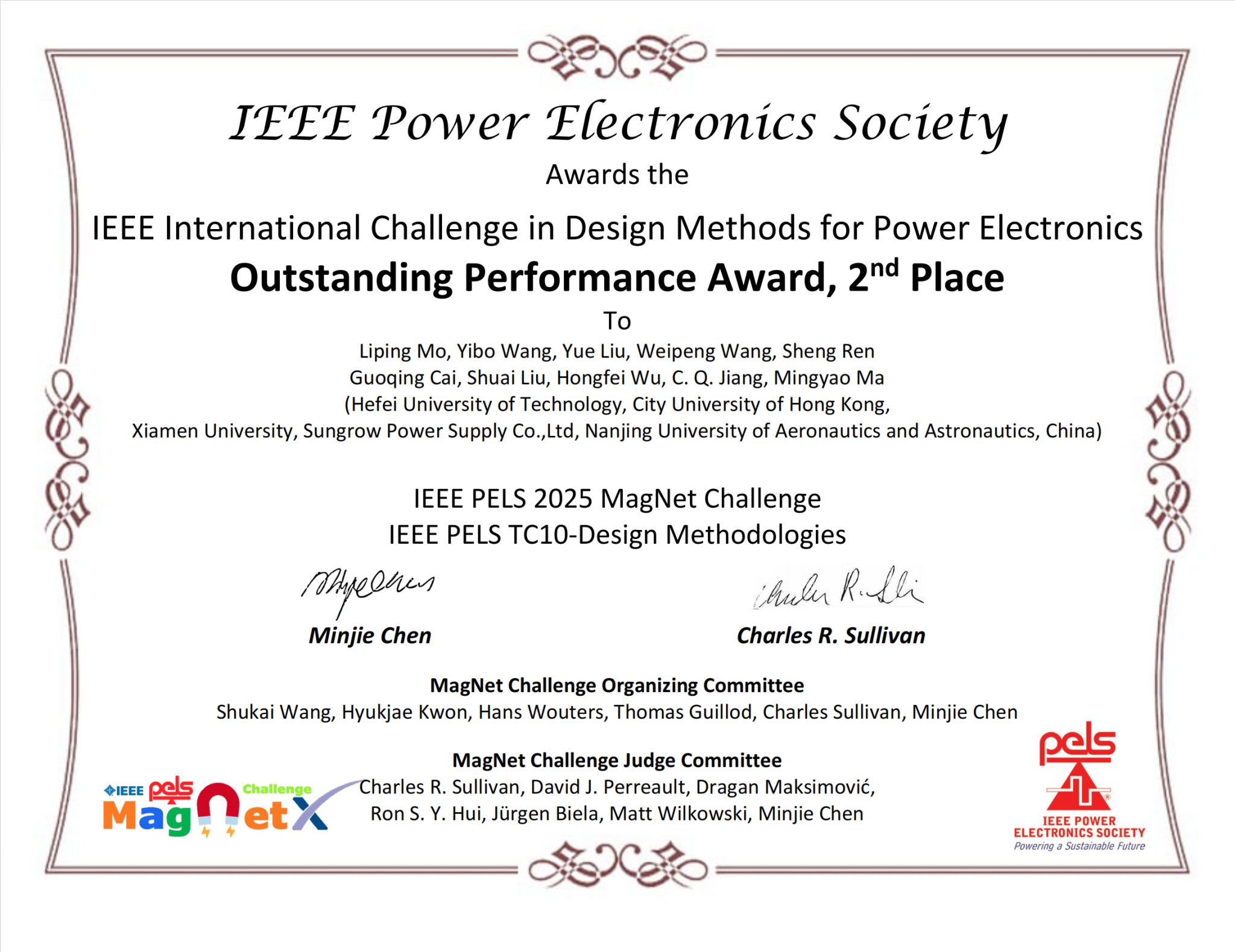 近日,全球电力电子磁建模领域顶级赛事IEEE MagNet Challenge 2 圆满收官。由我校电气与自动化工程学院恒爱精诚团队莫李平牵头,联合香港城市大学、厦门大学等高校组建的跨校联合战队HFUT-CITYUHK-XMU,在产业指导香港城市大学江朝强教授的悉心引领和阳光电源股份有限公司的全力支持下脱颖而出,一举斩获杰出性能奖全球第二名、最佳软件工程奖全球第一名(全球唯一)的佳绩,揽获赛事奖金10000美元,成为本次大赛亚洲地区唯一获奖队伍,也是本届大赛中唯一一支同时斩获两项大奖的参赛队伍,充分彰显了我校在电力电子磁建模领域的国际领先水平。