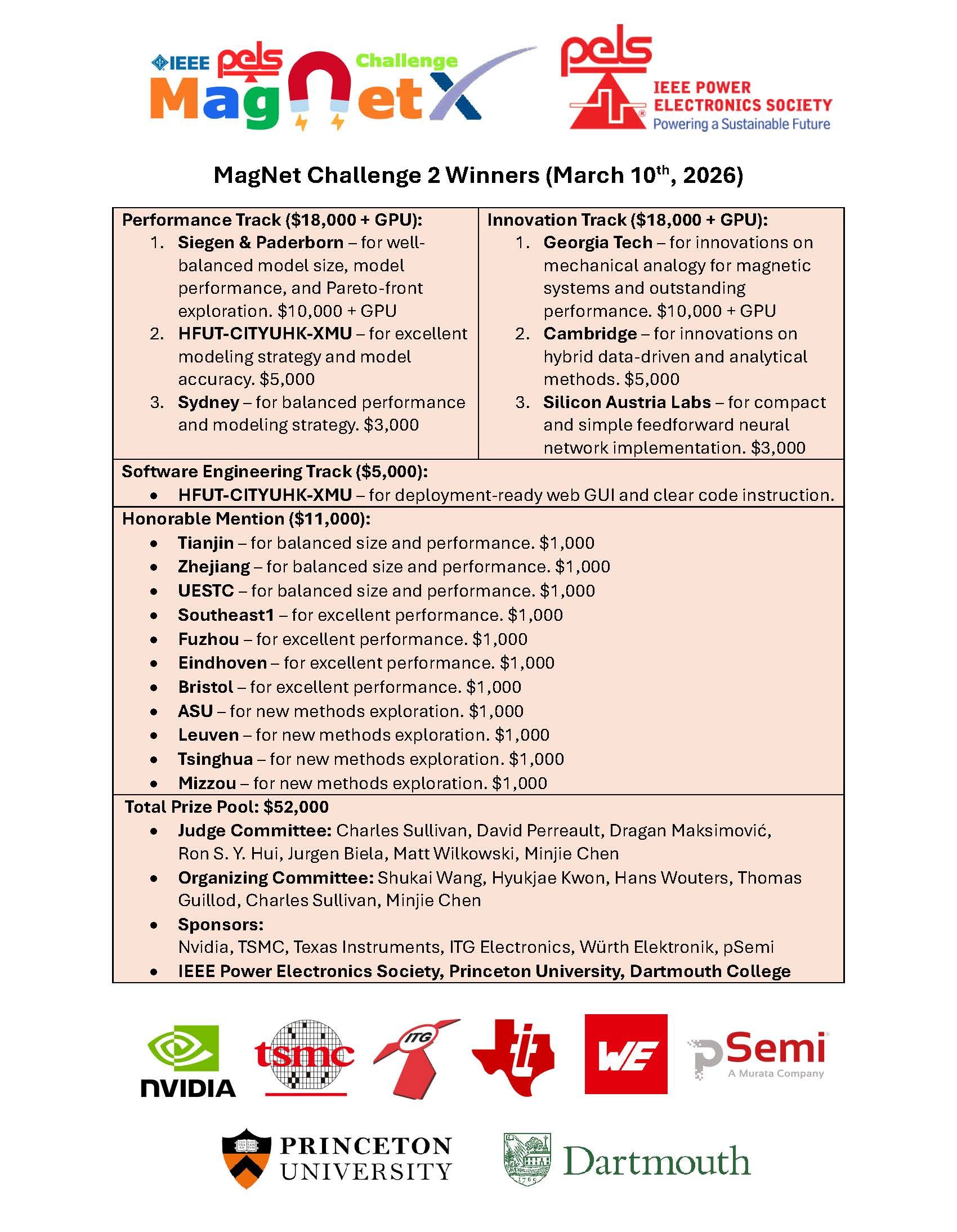 作为全球电力电子领域极具权威性与影响力的国际专业赛事,MagNet Challenge系列赛事专注于功率磁材料数据驱动建模、算法创新及工程软件研发三大方向,旨在推动磁材料的高效建模技术与工业应用深度融合、助力电力电子行业高质量升级。本届大赛由普林斯顿大学、达特茅斯大学、IEEE电力电子学会联合Nvidia、TSMC、Texas Instruments、ITG Electronics、Wurth Elektronik、pSemi等全球知名半导体与电力电子企业共同发起。专注于瞬态磁滞建模领域,吸引了全球15个以上国家及地区的40支顶尖队伍参加,历时近一年。参赛高校涵盖清华大学、华中科技大学、浙江大学、西安交通大学等国内高等学府,及剑桥大学、佐治亚理工学院、南洋理工大学、东京大学等世界一流高校,集中代表了全球功率磁建模领域的最高技术水平。