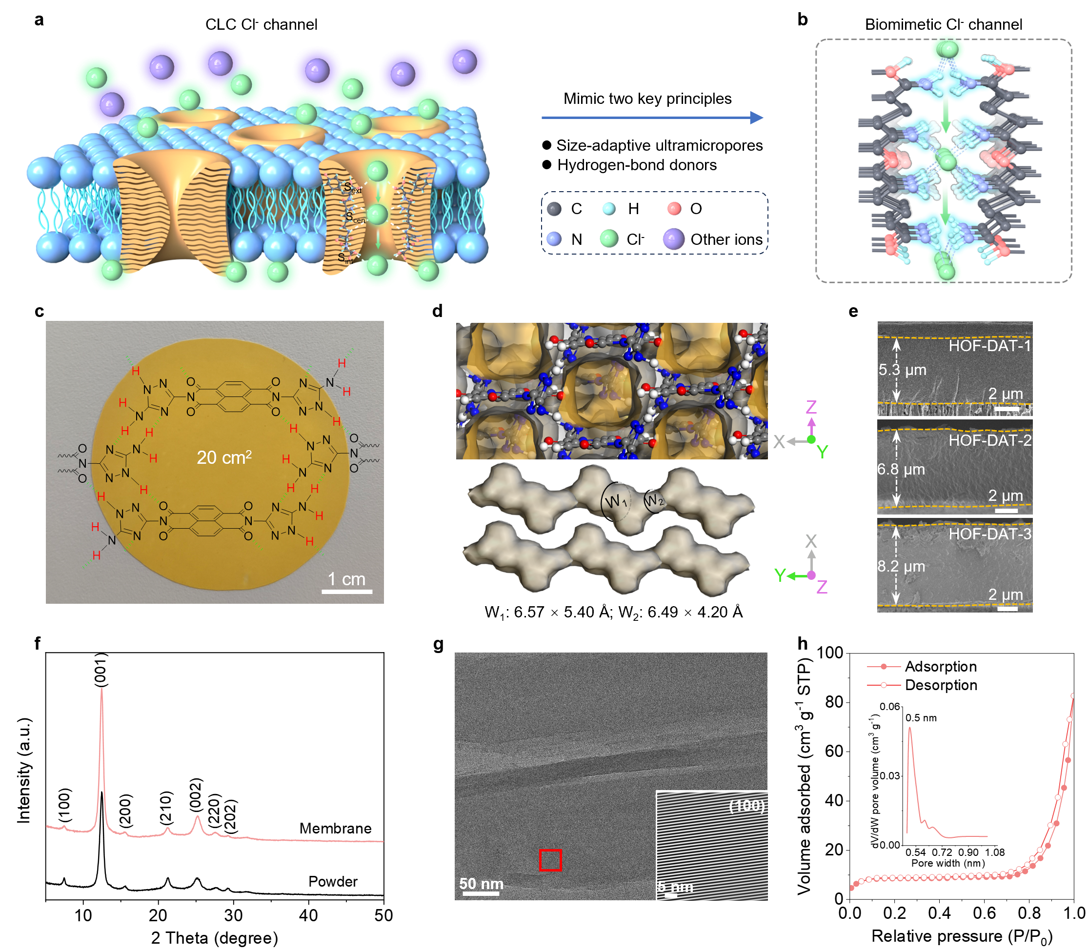 针对上述挑战,研究团队提出一种仿生设计策略,通过在HOF膜中构建类似CLC氯离子过滤器的超微孔道结构,实现对阴离子的尺寸筛分和能量补偿。该孔道不仅具有对Cl⁻的适应性尺寸,还引入了氢键供体以提供“低粘度”补偿作用,有效降低离子脱水过程中的能量损失。借助Cl⁻与较大阴离子(如SO₄²⁻)在脱水和能量补偿方面的差异,该膜实现了Cl⁻/SO₄²⁻选择性超过400,比现有同类膜高出数十倍;同时Cl⁻渗透速率是商用Neosepta® ACS膜的两倍。在处理高盐废水的电渗析应用中,该膜实现了更高的NaCl产品纯度(99.62 wt%对比72.86 wt%)且能耗比Neosepta® ACS膜低28.7%。这一研究不仅展现了氢键有机框架作为人工离子通道构建平台的潜力,也通过仿生微环境工程设计,为新一代分离膜的开发提供了重要范式。