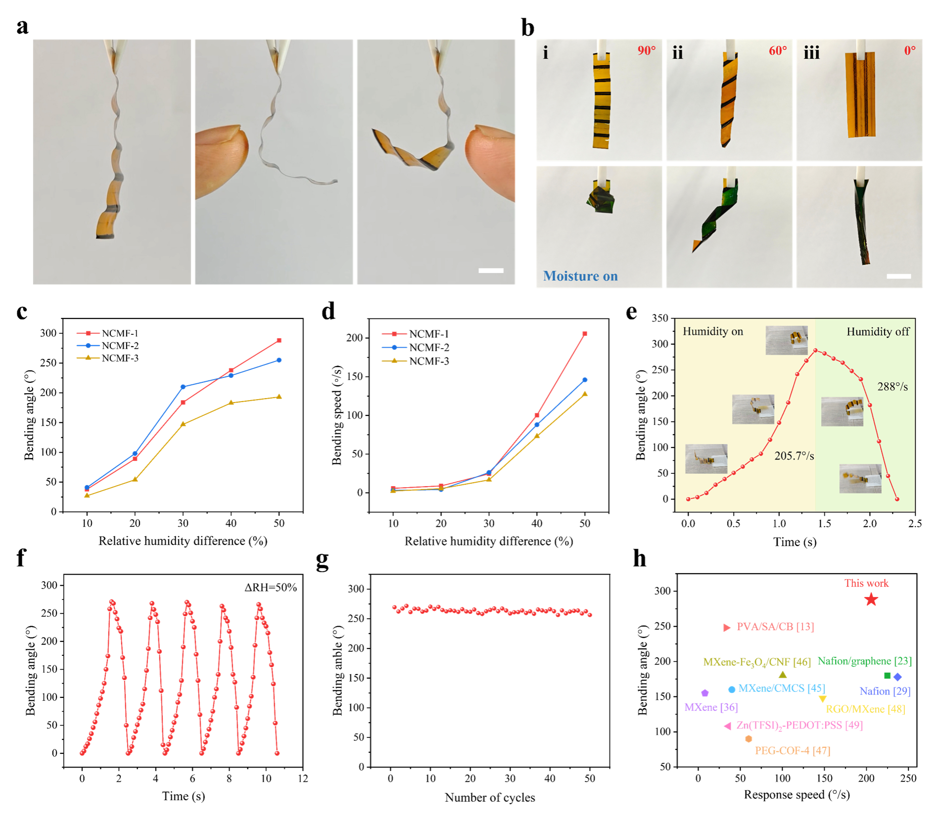 图3. NCMF薄膜的湿度驱动性能与可编程变形