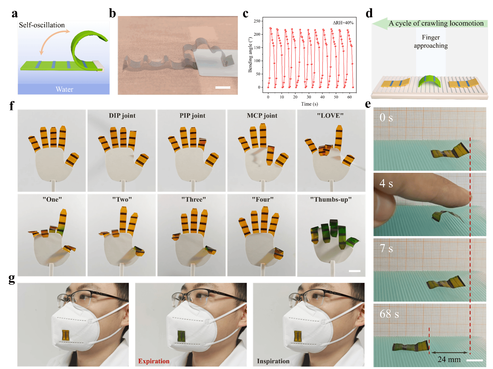图5.基于NCMF驱动器的湿驱自振荡、爬行机器人及智能口罩应用