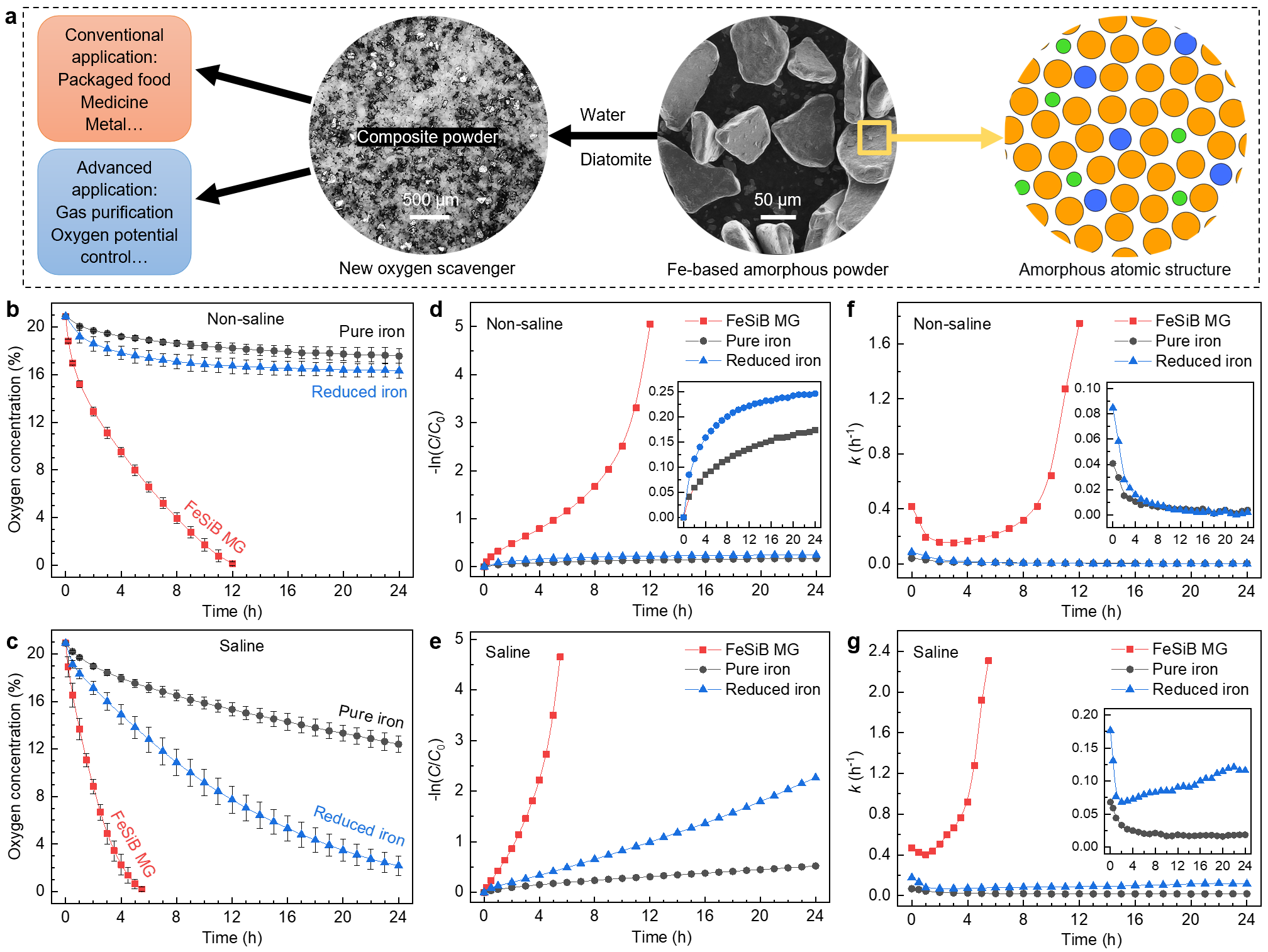本研究以铁硅硼(FeSiB)非晶合金为基础研发新型除氧材料,创新性提出 “非晶结构降低吸附能垒 + 多组分协同氧化 + 自催化微结构调控” 的高效除氧新策略。实验结果表明,该材料的除氧速率较广泛应用的晶态铁系材料提升1-2个数量级。无电解质条件下,FeSiB非晶合金的除氧速率是纯铁粉的60倍、还原铁粉的41倍;即便添加电解质优化后,仍保持着40倍和9倍的优势,能够在5.6小时内实现密封体系中氧气的完全去除(定义为氧浓度<0.05%),而纯铁粉和还原铁粉体系即便在最优条件下,24小时内也无法完成完全除氧。该材料还突破低温应用瓶颈,在5 ℃低温环境下可在15小时内实现完全除氧,而传统材料在此条件下几乎失效。